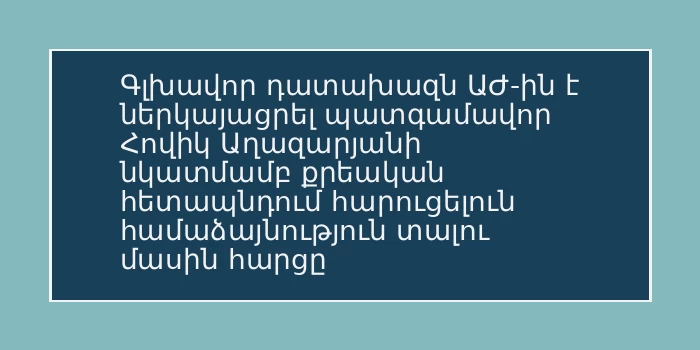 Գլխավոր դատախազն ԱԺ-ին է ներկայացրել պատգամավոր Հովիկ Աղազարյանի նկատմամբ քրեական հետապնդում հարուցելուն համաձայնություն տալու մասին հարցը