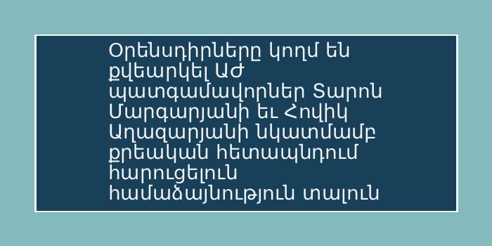 Օրենսդիրները կողմ են քվեարկել ԱԺ պատգամավորներ Տարոն Մարգարյանի եւ Հովիկ Աղազարյանի նկատմամբ քրեական հետապնդում հարուցելուն համաձայնություն տալուն