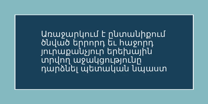 Առաջարկում է ընտանիքում ծնված երրորդ եւ հաջորդ յուրաքանչյուր երեխային տրվող աջակցությունը դարձնել պետական նպաստ