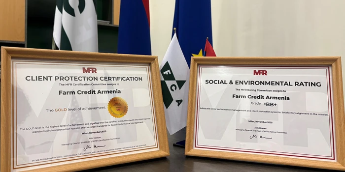 MicroFinanza Rating (MFR) անկախ միջազգային վարկանիշային ընկերությունը (Իտալիա) «Ֆարմ Կրեդիտ Արմենիա» ՈՒՎԿ ԱԿ-ին շնորհել է Հաճախորդների պաշտպ...
