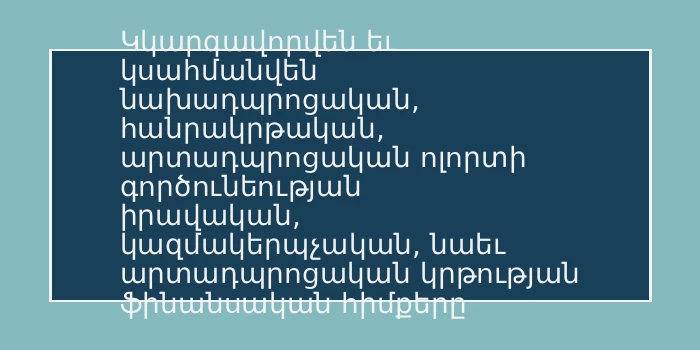 Կկարգավորվեն եւ կսահմանվեն նախադպրոցական, հանրակրթական, արտադպրոցական ոլորտի գործունեության իրավական, կազմակերպչական, նաեւ արտադպրոցական կրթության ֆինանսական հիմքերը